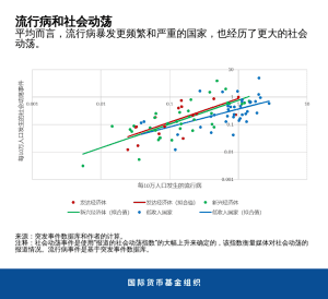 但从长远来看,社会动荡的风险会大幅上升。骚乱和反政府示威的风险随着时间的推移而增加。此外,该研究发现了可能导致政府崩溃的重大政府危机的风险增加的证据,通常在严重爆发后的两年内。根据历史经验,随着疫情的消退,社会动荡可能会再次出现,其影响将更加明显。如果危机暴露或加剧了先前存在的问题,例如对机构缺乏信任、治理不善、贫困或不平等,那么社会动荡的风险就会更大。