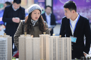 A woman talks with a salesman at a property market fair in Hangzhou, Zhejiang province.