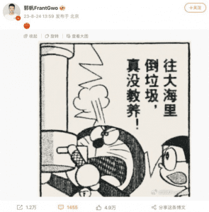 Guo Fan, the director of the popular Chinese sci-fi movie “The Wandering Earth,” took a unique approach by using the Japanese manga “Doraemon” to satirize the act, saying, “Dumping trash into the sea, really uncultured.”